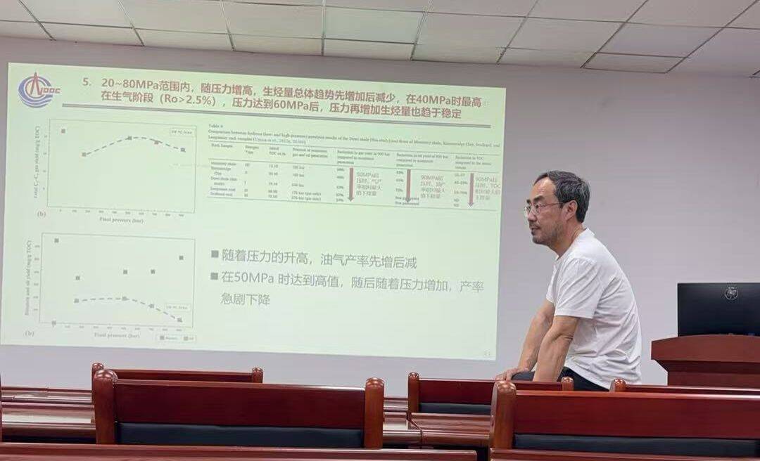 徐教授以《高压对烃源岩生烃的影响》为题,围绕烃源岩生排烃物理模拟技术展开讨论,明确不同水体盐度、丰度烃源岩生烃特征、排烃效率及定量演化模式,分析超压作用对生排烃效率的影响,通过获取烃源岩生排烃产物的地化实验测试数据,得到不同类型烃源岩生排烃模式图版。 “TOC差异较大时,TOC越高生烃潜力越好;TOC差异不大时,生烃潜力由氢指数HI控制”,徐教授讲解道。生烃过程随压力的变化大致可分为两个阶段:第一阶段——促进生烃:随压力的增加,分子间距缩小,反应频率增大,同时保孔作用促进烃类排出;第二阶段——抑制生烃:随压力继续增加,高压抑制流体产物体积膨胀,同时压力由保孔作用转变为降孔作用,产物浓度升高,生烃趋于平衡。以涠西南凹陷为例,在高压促生油区间内有利于生油。