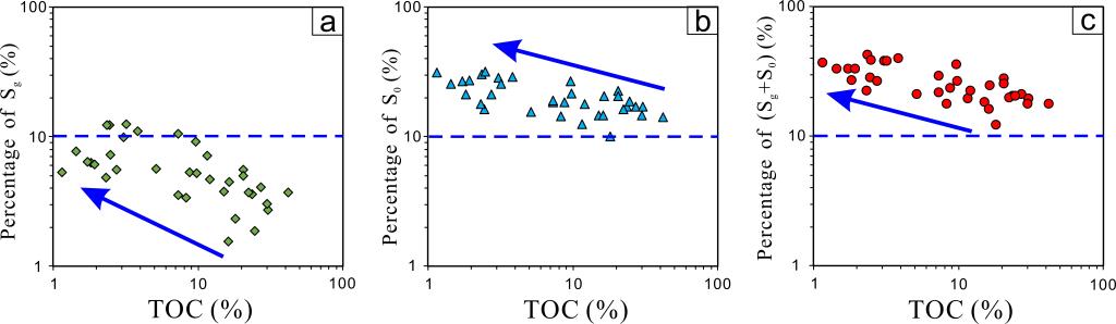 在该方法中,采用了更精细的升温程序划分:3分钟保持通氮气,但程序不升温,罐体保持低温状态,此时检测器检测的烃类化合物为游离气态烃(Sg);随后温度快速升温到90℃,并保持5分钟,这个过程中检测器检测到的是轻烃组分(S01);最后温度快速升温到300℃,并保持15分钟,这个过程中检测器检测到的是游离油组分(S1)。游离气态烃(Sg)、轻烃组分(S01)、游离油组分(S1)三者相加之和才是泥页岩真正的含油率这个数据相较于常规的热解参数S1而言,前两者在以往的页岩油含油性评价过程中被明显的忽略了,且这两个组分的散失对最终含油性结果的影响与样品的TOC值息息相关。TOC越低,轻组分的散失对页岩含油性评价结果影响越大(图2)。