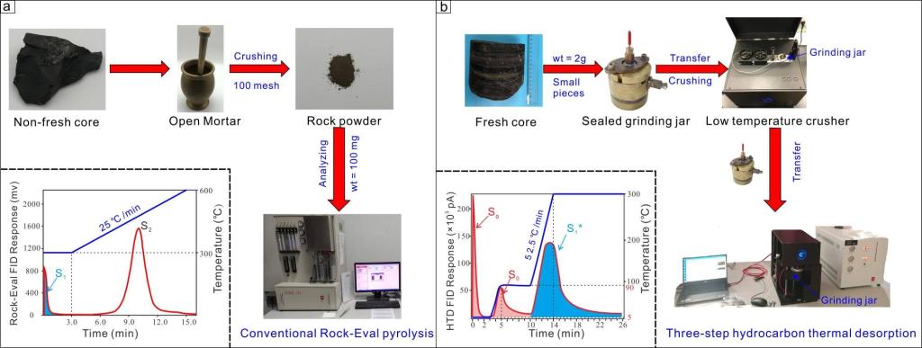 为此,徐耀辉教授团队联合苏州冠德能源科技有限公司建立了一套现场冷冻取样-低温密闭研磨-多温阶热释-组分分析一体化泥页岩含油性检测分析方法,能最大限度减少样品处理过程中轻组分散失对页岩含油性评价结果的影响,提供更为精准的页岩含油性参数。该方法相较于常规热解S1法而言,将分析测试设备从实验室内挪到了钻井现场,对新钻取页岩样品进行及时取样,在密闭研磨罐中进行快速冷冻,并在样品研磨过程中保持研磨罐的低温状态,且在研磨结束后直接将罐体转移到检测系统中,最大可能的保留了轻烃组分(图1)。