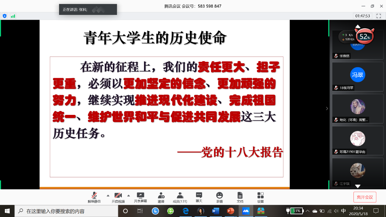 (图/文:吕秀迪)为进一步做好开云官方网页版官网党员发展工作,加强对发展对象和入党积极分子的教育和培养,引导其提高思想觉悟,保证发展新党员的质量。资环学院于2020年5月18日晚19:00以线上腾讯会议的形式举行了2020年上半年入党积极分子和党员发展对象培训会议。资环学院党委书记张科主讲,党委副书记范梅英参加、本科学生工作党支部书记李春花主持,共130余名入党积极分子和党员发展对象线上学习。