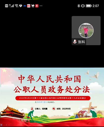 为进一步强化全院教职工纪法意识,推进党风廉政宣教月活动深入开展。9月22日下午,资环学院邀请开云官方网页版官网纪法知识宣讲团、校办法律事务科科长党利霞老师于腾讯会议解读《中华人民共和国公职人员政务处分法》,宣讲活动由学院党委书记张科主持,全院教职工线上参会。