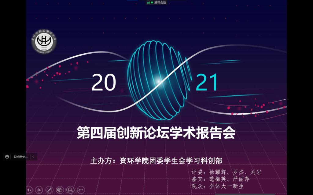 (通讯员 王泽瑞 图/文)11月28日19:00,为展示我院大学生的优秀科技成果,培养学生的创新意识和创新能力,促进学科的交叉融合。资环学院第四届创新论坛学术报告会于线上隆重举行。本次活动由资环学院团委学生会主办,学习科创部承办,副院长徐耀辉教授、刘岩教授、罗杰教授担任评委,党委副书记范梅英老师、团委书记严丽萍老师担任嘉宾出席,资环学院2021级全体学生进入视频会议参会。