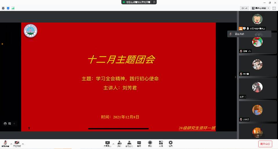 (通讯员 王瑞林 图/文) 2021年11月8日至11日,中国共产党第十九届中央委员会第六次全体会议胜利举行。全会听取和讨论了习近平总书记受中央政治局委托作的工作报告,充分肯定党的十九届五中全会以来中央政治局的工作,审议通过了《中共中央关于党的百年奋斗重大成就和历史经验的决议》,审议通过了《关于召开党的第二十次全国代表大会的决议》。2021年12月8日中午11时,我院指导督促研究生各班举办12月政治理论学习主题班会。