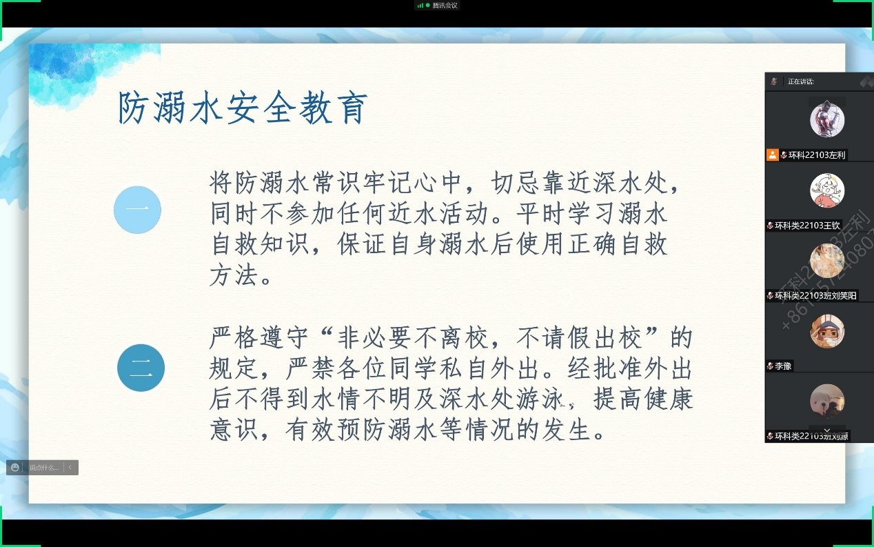 首先,由各班安全委员为同学们详细讲解PPT上相关内容,如何去避免溺水情况的发生、溺水时如何自救、遇到他人溺水应当如何在保护自身安全基础上去帮助他人,同时强调了在疫情期间学校的防疫相关规定,留校学生要严格遵守“非必要不离校,不请假不离校。” 坚持完成每日健康打卡、晚点名和核酸检测等,在此基础上安全委员播放了安全教育视频,让同学们理解更加透彻。