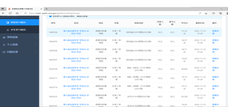 在本次学习中,同学们热情高涨,态度积极,高效及时地完成了学习任务全体本科生均完成宪法学习,且多数平均分超过90分。并且同学们在线上学习、线上答题的过程中,同学们在学中答、再答中学,效果显著,反响热烈。为资环学院宪法学习教育,汇聚了源源动力,在全院营造了浓厚的宪法学习氛围。