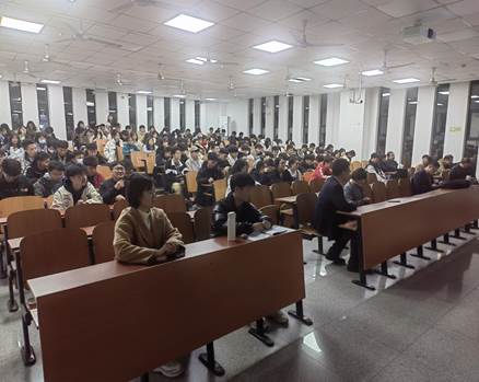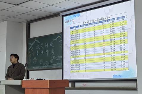 随即,黄鹏老师为同学们详细介绍了往年水环专业的过级、升学和就业等情况。黄鹏老师讲到:“我们学院的学风建设成效显著,水环系英语四级一次性通过率普遍超过80%;考研率多年位于前列,其中考取河海大学、中国地质大学(武汉)等大学的人数居多;就业方向更是广泛,有着水文局、环保局、地质局、三大石油公司等,就业率平均达到93%以上。无论是考研升学,还是就业,其比率都位于各院前列,并且有着众多的选择方向。”