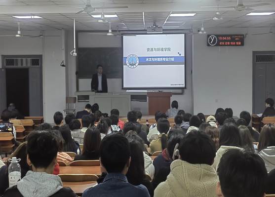 会议之初,王老师从专业设置,国家发展,师资力量等方面为同学们进行介绍水环系基本情况,让同学们对水环系的学习,发展,优势等有一个明确具体的认知。最后以“和谐师生,幸福资环”作结,衷心期盼欢迎同学们的到来。