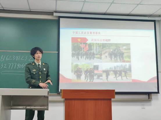 黄榜同学分享他的军旅生涯。役前训练、分兵种、定兵,他幽默地讲述成为一名正式军人的流程。五公里越野、扛圆木、雪夜执勤…经历了艰苦的训练和磨砺,他从一名新兵蜕变为荣归故里的军人,也收获了更加坚强的意志。他告诉同学们,在部队里要学会忍受枯燥与寂寞,在军营中绽开青春之花。最后,黄榜同学无比自豪地表示,尽管自己的青春没有别人精彩,但他从未后悔把青春献给党和国家,他无愧于脚下这片土地,参军报国,无上荣光!