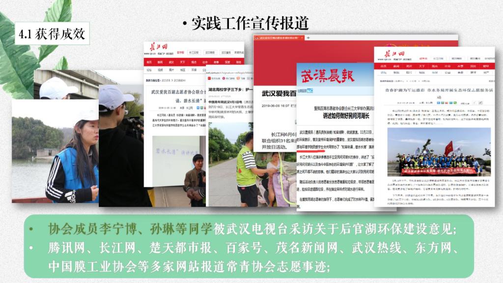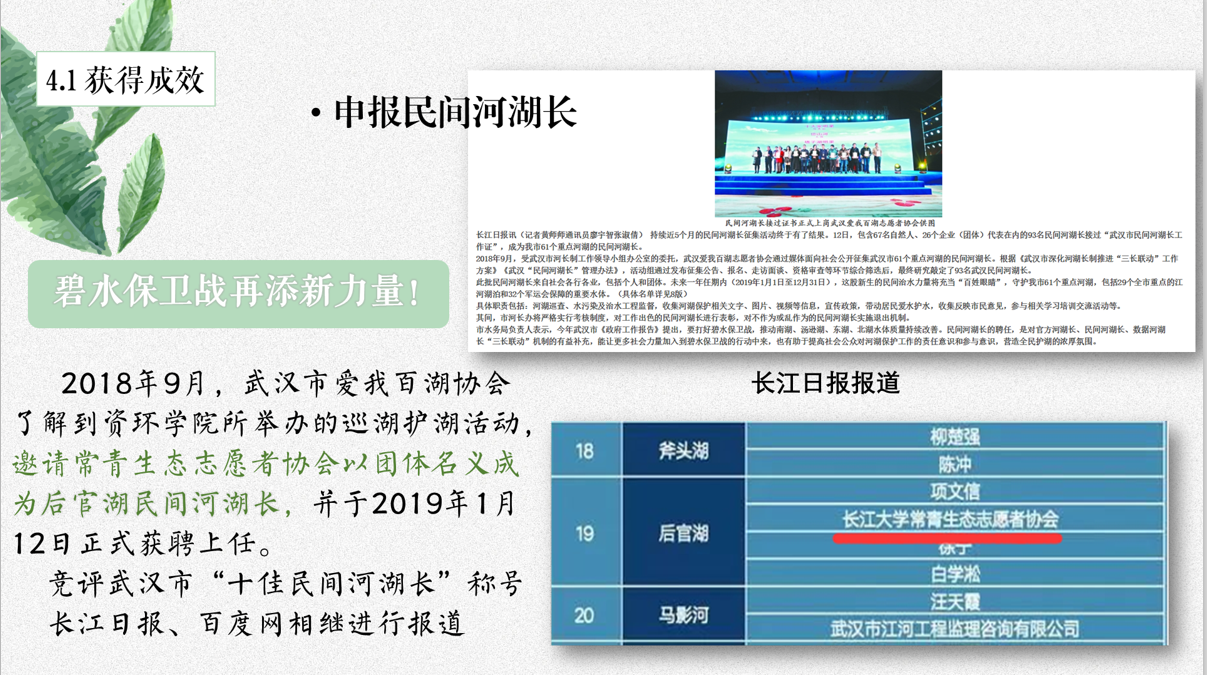 我校常青生态志愿者协会从最初的组织运营再到获得省铜奖,五年的时间里,就取得了质的飞跃,这得益于常青生态志愿者协会的老师以及志愿者们不曾间断的组织青年学生深入乡村开展志愿活动,自2019年至2020年连续两年担任武汉市蔡甸区后官湖民间河湖长。服务内容以每月进行的巡湖测水质活动为基础,组织各类创新环保志愿活动模式,坚持走乡村绿色发展之路;定期开展的环保演讲活动,是口才与志愿服务的相碰,撞出多元的环保理念;暑期三下乡活动,引导了广大青年学生聚焦实施乡村振兴战略,将环保志愿精神传递至乡村,发扬至社会;废物利用活动、志愿家教等活动也激发了不少同学投身环保志愿活动的积极性。