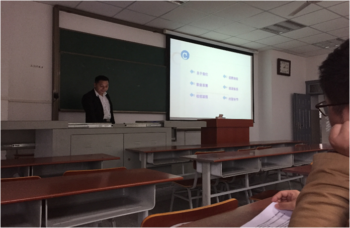 (通讯员 汤英豪 文/摄)2016年11月16日下午3时许,应资环学院学生工作办公室主任刘娥老师的邀请,武汉巨人教育来我校进行校招宣讲,宣讲地点为武培B307。