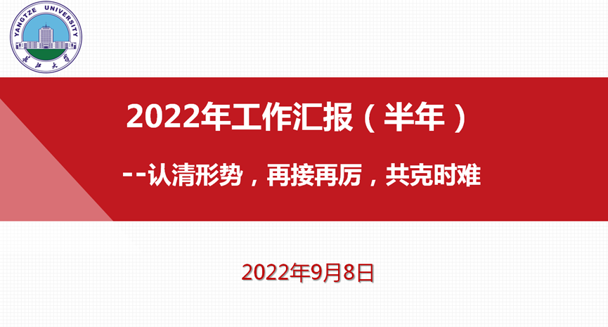 硕果累累,未来可期。梦想新年开门红,“水文水资源工程”获批国家一流本科专业;课程建设上台阶,“资源与环境概论”获推荐湖北省一流本科课程;实验室改革传喜讯,“油气地球化学与环境湖北省重点实验室”获批建设;科学研究出硕果,学院国家自然基金获批8项,位居全校榜首;学生工作精益求精,四级通过率再提升,稳居全校前列;教授团队建设成果、教师个人荣誉、科技成果产出百花齐放。会议第二议程,学院院长文志刚作题为“2022年工作汇报(半年)—认清形势,再接再厉,共克时艰”的工作报告。