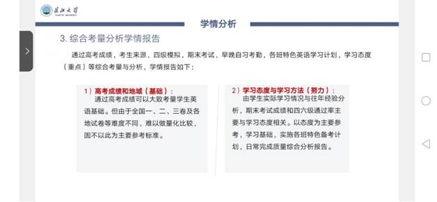 在资环学院2020级本科生英语学情部分,李春花老师展示了2020级各班上学期期末英语成绩,提出应参考高考英语成绩与学习态度及方法两个方面进行英语学情的分析。