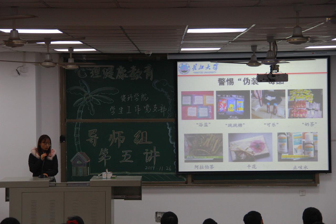 (通讯员 蒋超 图/文)为了加强学生生命安全及自我保护意识,开云官方网页版官网于2019年11月下旬很荣幸邀请到了大学生心理健康中心的商麟鑫老师,地球科学学院罗小玉老师,石油工程学院刘少文老师,以及校团委荆鑫老师还有我们院辅导员李春花老师给19级新生开展了包括心理健康,网络安全,防火防电防艾防溺水和远离毒品等多个方面共五场安全专题讲座。