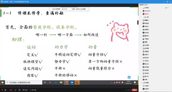 讲座伊始,冯思瑶首先进行了简单的自我介绍,随后引出讲座的第一个部分,“关于延期开学,应该如何学习”,她认为在家里学习很容易荒废时间,家里不像在学校那么紧张,这对同学们的自控能力提出了要求。她表示同学们应该停课不停学,抓住机会,查漏补缺。拒绝“填鸭”式教育,摆脱老师讲什么就听什么、老师布置什么就做什么的思想,而是应该以老师的安排为主,自己的薄弱环节自主加强,随后她着重介绍了自我分析、查缺补漏的具体方法,并举例对其进行说明。