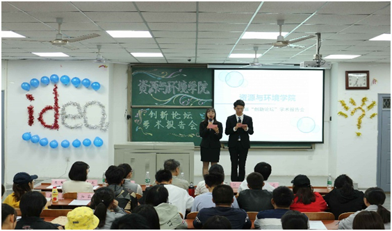 (通讯员蔡依玲 图/范达福 文)为“弘扬学术,激励创新”,展现资环学院创新风采,激励资环学子创业热情,由资环学院团委学生会学习部组织策划的资环学院创新论坛学术报告会于10月12日晚18:30在武培B108进行。此次报告会由刘于民、姜晓萱担任主持,资环学院党委书记朱思源,副院长赵红静等出席此次大会。