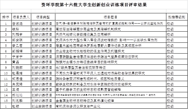 根据教育部关于印发《国家级大学生创新创业训练计划管理办法》的通知(教高函[2019]13号),以及学校《关于我校第十六批“大学生创新创业训练计划”项目申报的通知》,我院于1010日和11日分别对申报的25个创新训练项目和1个创业实践项目进行了评审工作。经过项目负责人PPT汇报、评委专家现场提问、评审小组评分等环节,确定其中的16项拟推荐为校级项目。按照学校相关文件精神,大学生创新校级项目资助经费4000元,学院规定中期考核合格拨付经费的80%,通过结题拨付剩余的20%。中期考核不合格者项目终止,不予以资助。现将结果公示如下: