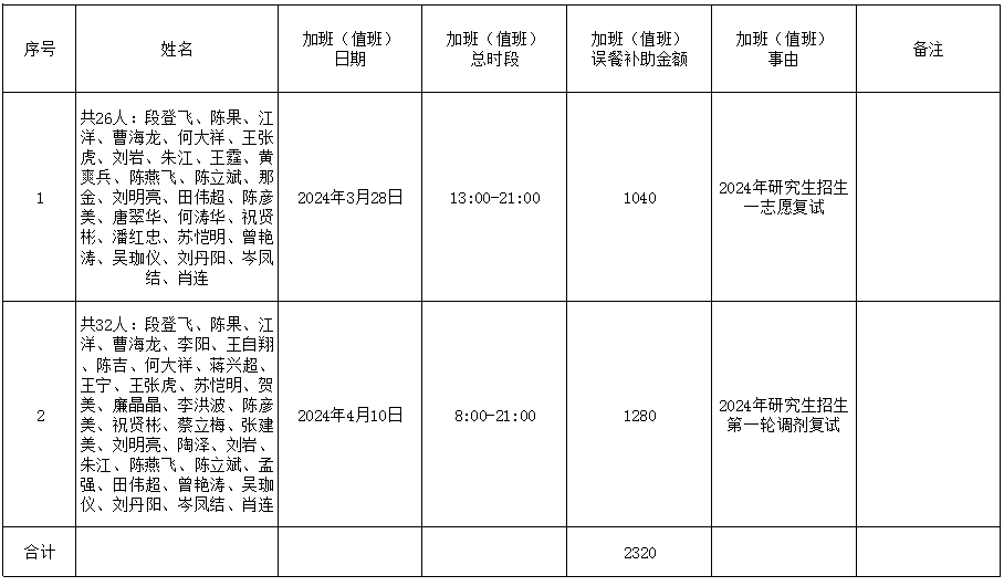根据《开云官方网页版官网加班(值班)误餐补助管理办法(试行)》(长大校发【2019】83号)文件规定,现对资环学院加班(值班)误餐情况(2024年3月28日、2024年4月10日两天研究生招生复试)进行公示,如果对加班(值班)误餐情况有异议,可以通过电话或电子邮件等方式向资环学院办公室反映。